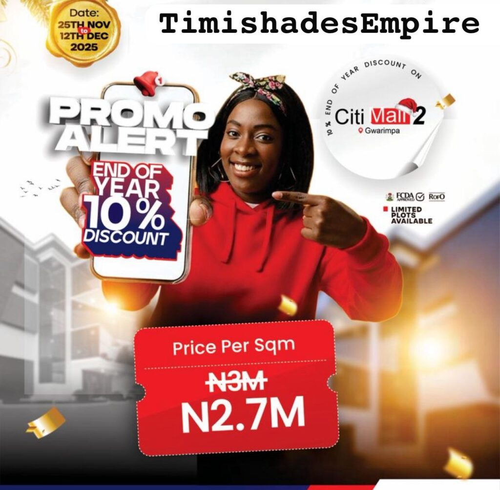 Commercial real estate remains one of the strongest wealth-building assets in Abuja, and Citi Mall 2, Gwarinpa, presents a unique opportunity for smart investors. As part of Timishades Empire’s end-of-year promo, Citi Mall 2 is available at a discounted rate for a limited time. Citi Mall 2 – Gwarinpa Gwarinpa is one of Abuja’s most populated and commercially active districts, making it ideal for retail, office, and mixed-use developments. Why Invest in Commercial Property Now Citi Mall 2 is suitable for entrepreneurs, investors, and developers looking to secure a commercial asset with steady returns. Limited-Time Opportunity With the 10% discount ending on 12th December 2025, this is the best time to lock in value before prices increase. Final Note Whether you’re buying land for personal use, future development, or investment, Timishades Empire offers verified land in prime Abuja locations with a smooth, transparent buying process. 📞 Now is the time to act. Secure your plot before the promo ends.